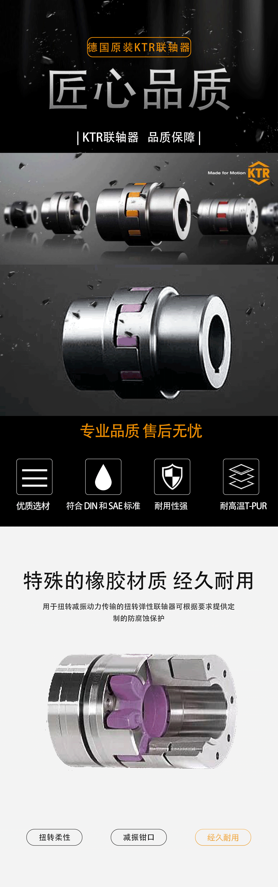 零间隙设计: KTR ROTEX 联轴器采用零间隙设计,能够补偿轴的不对中,确保传递的动力不会受到轴对准的微小偏差的影响。
